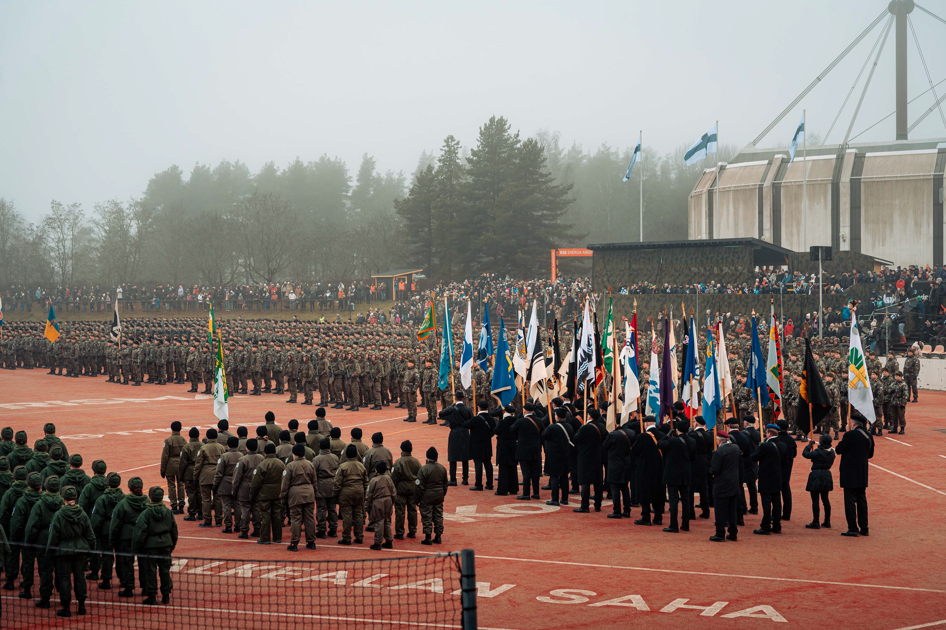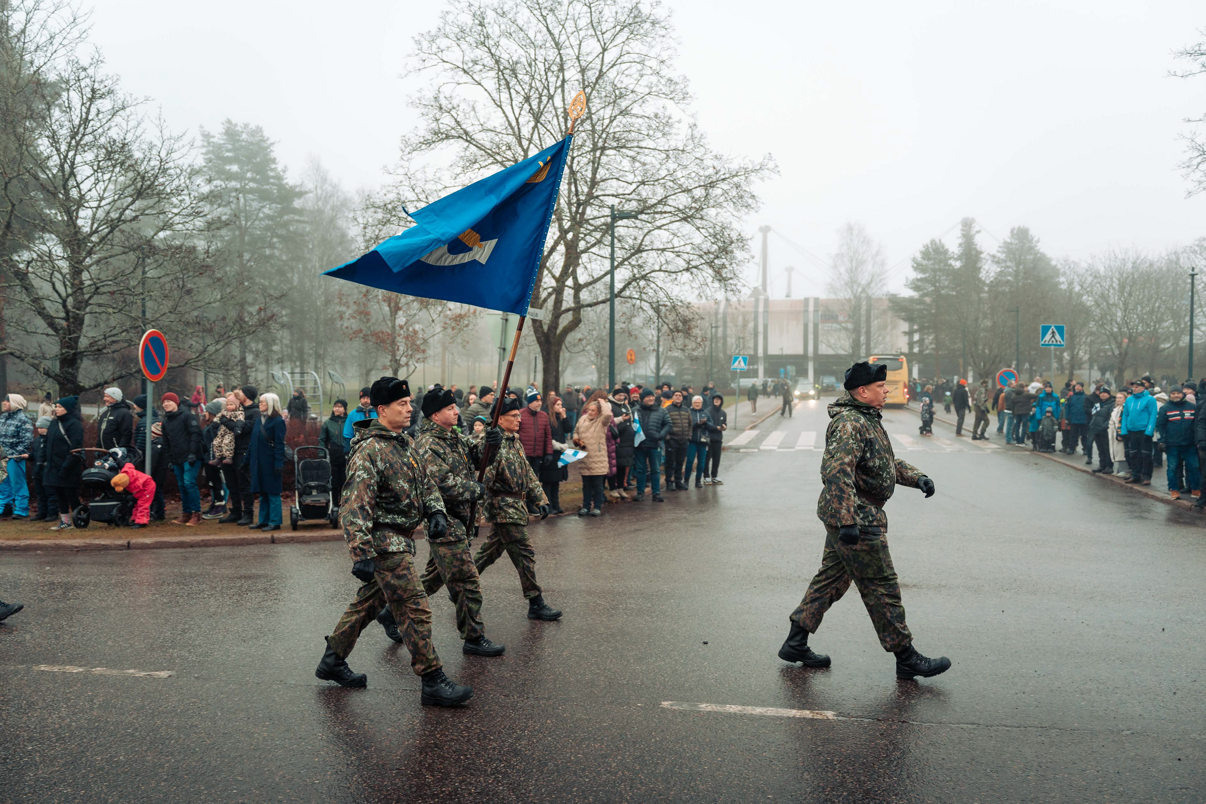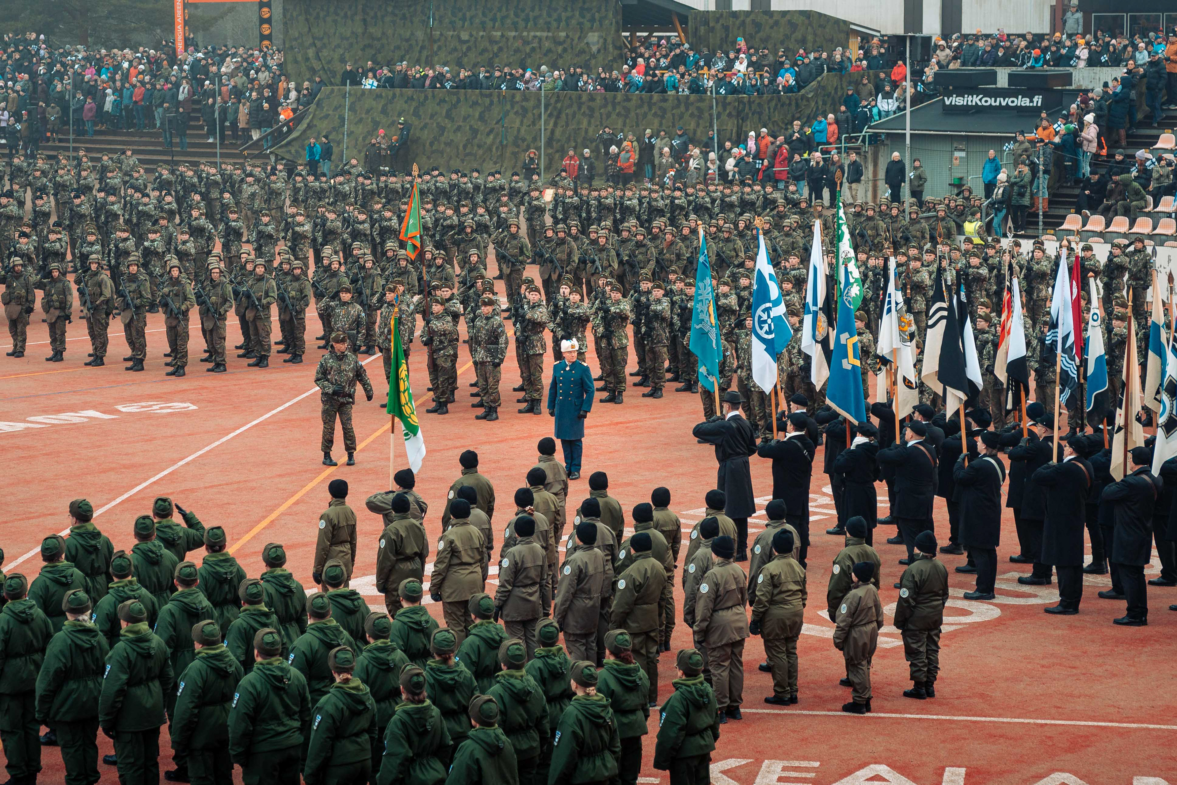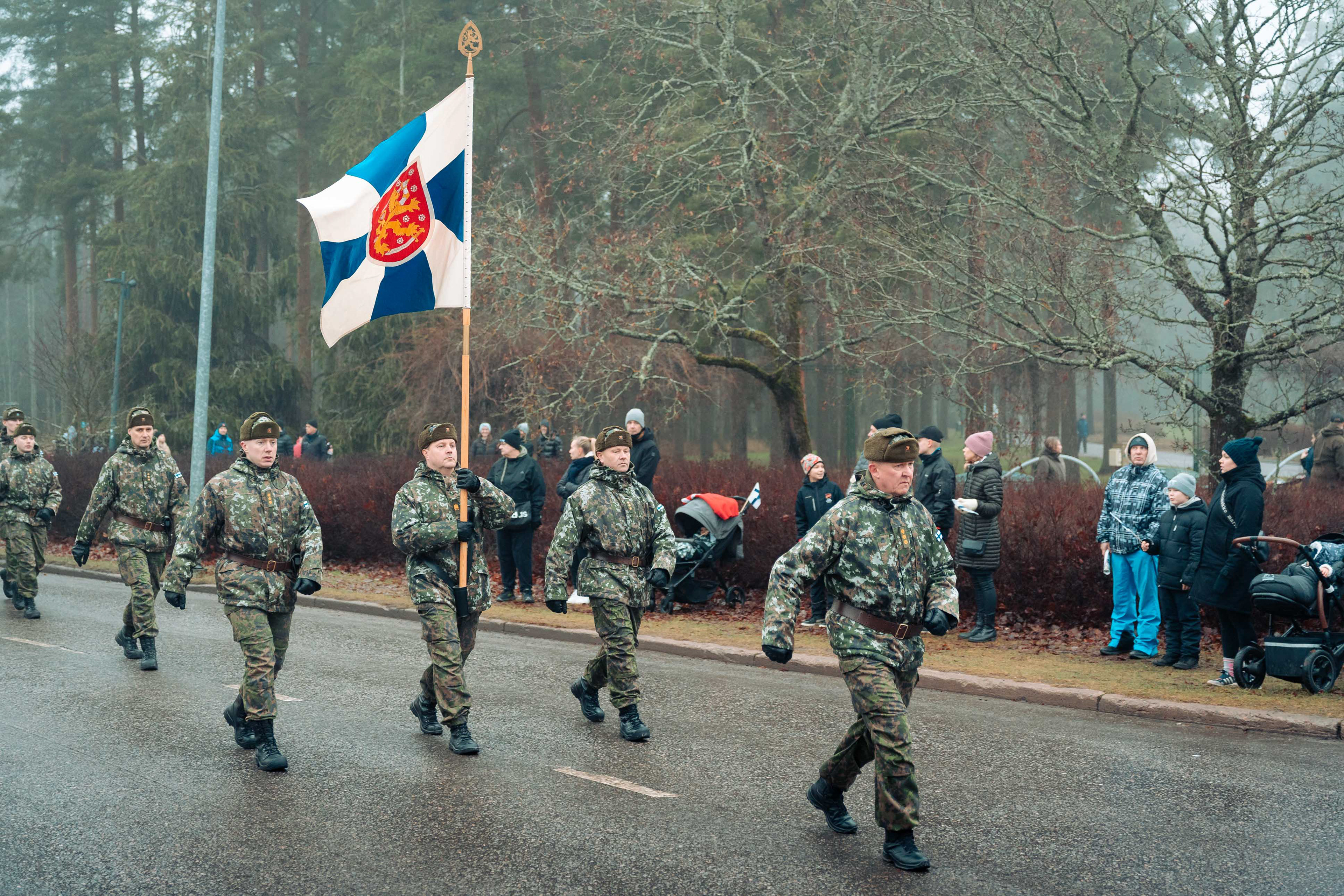 Kielekkeellinen valtionlippu ohimarssin etupäässä.