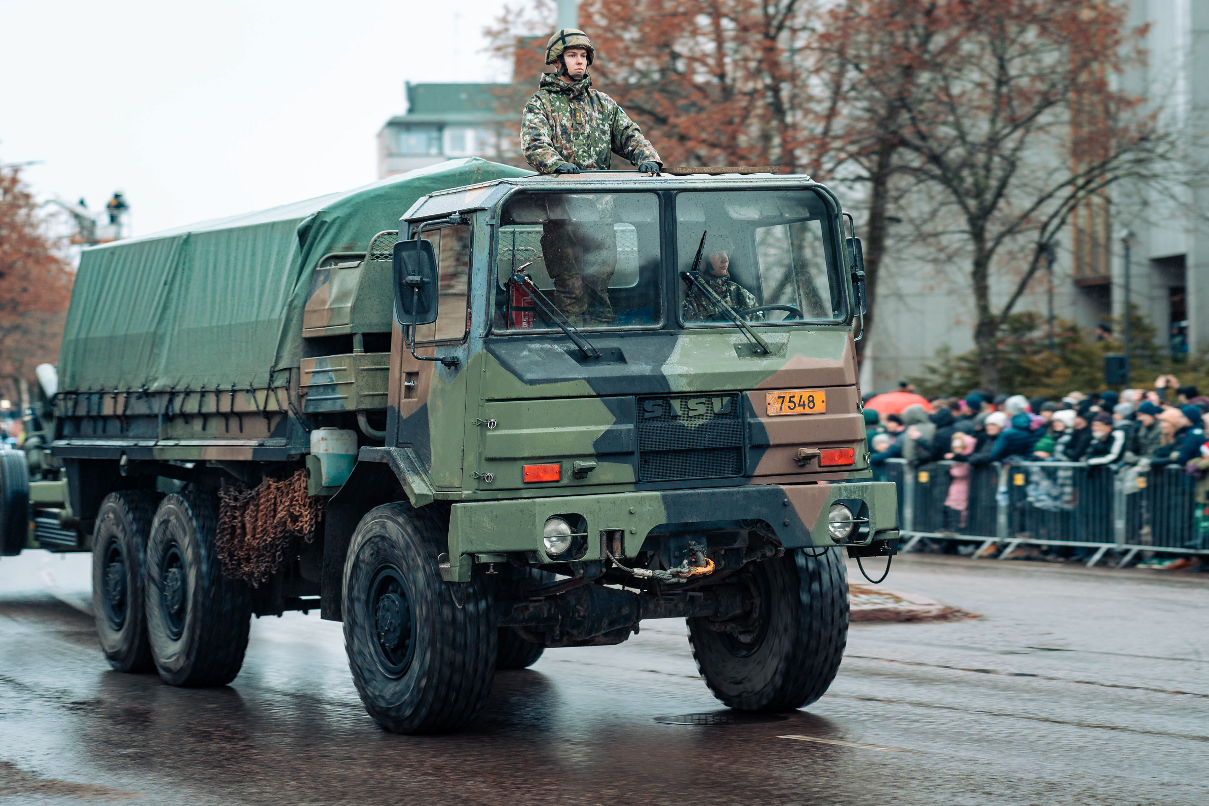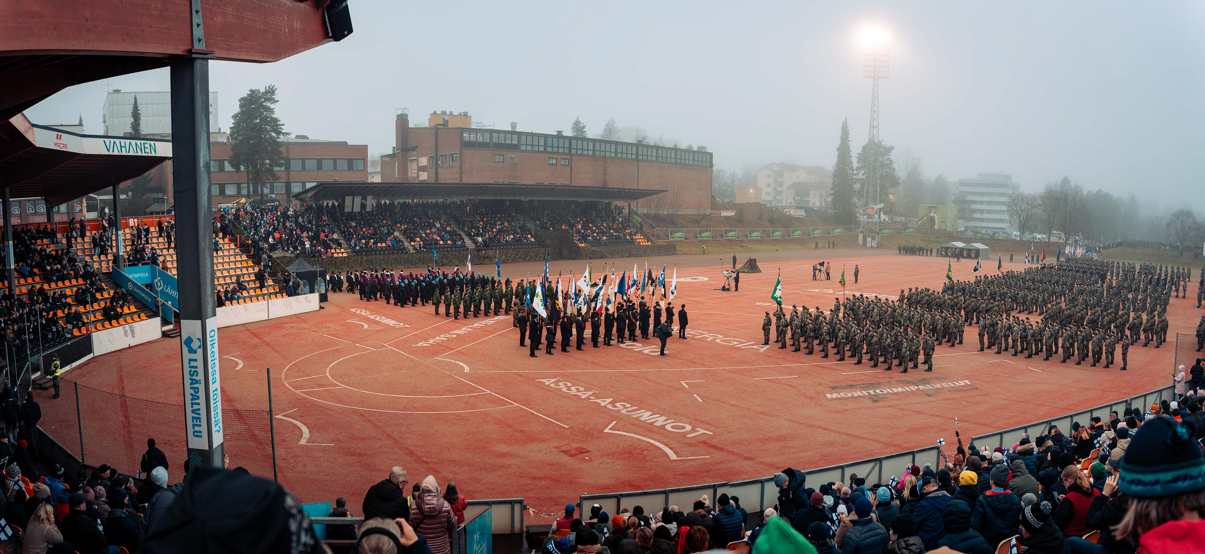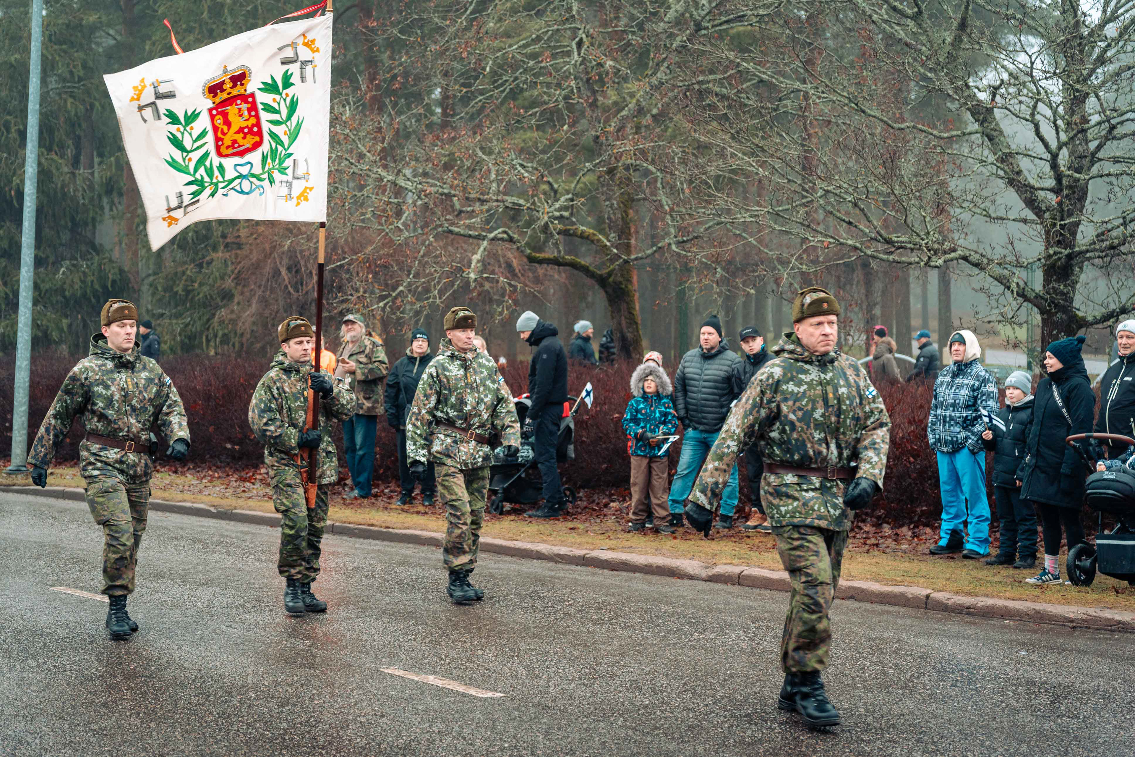 Kielekkeellinen valtionlippu ohimarssin etupäässä.