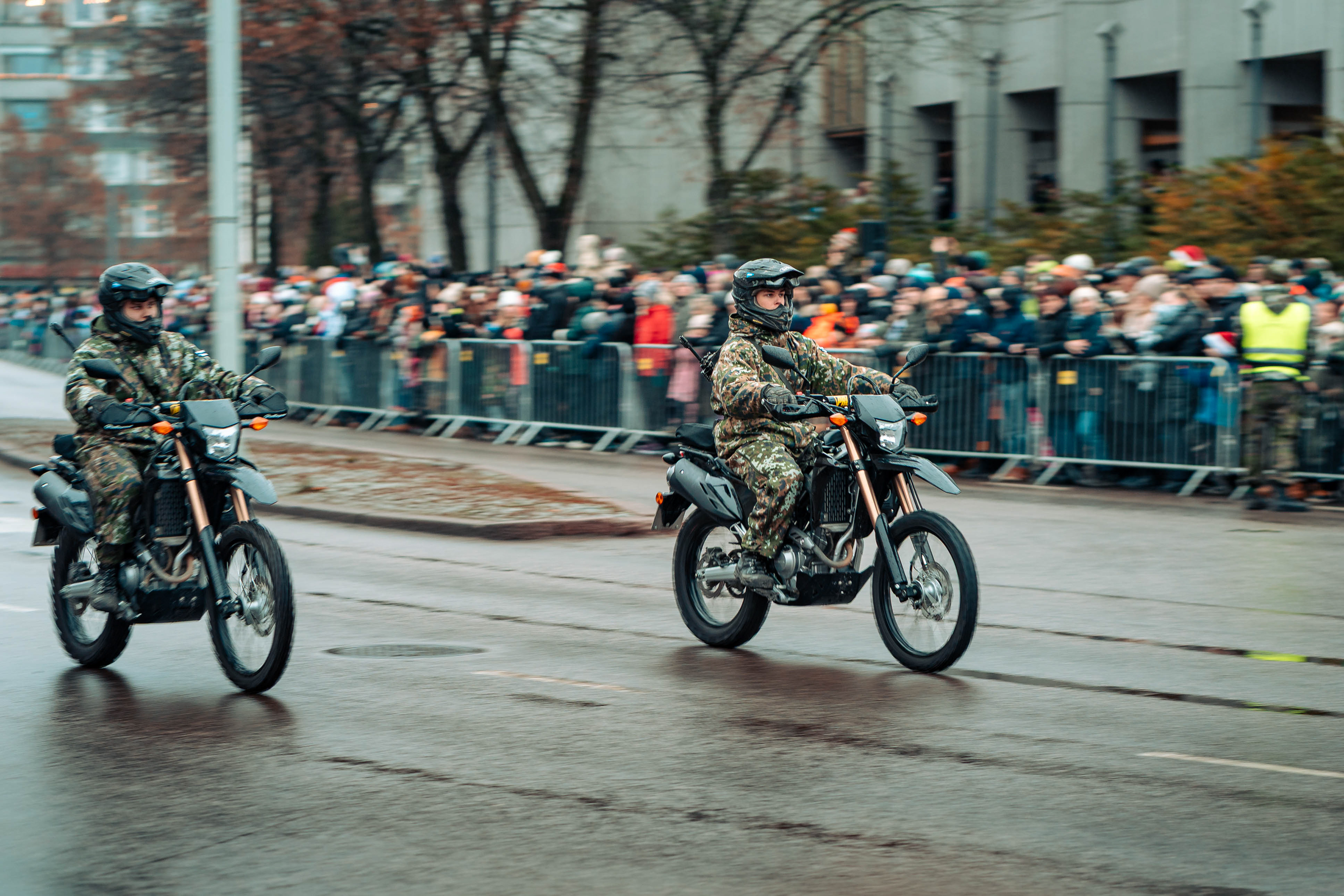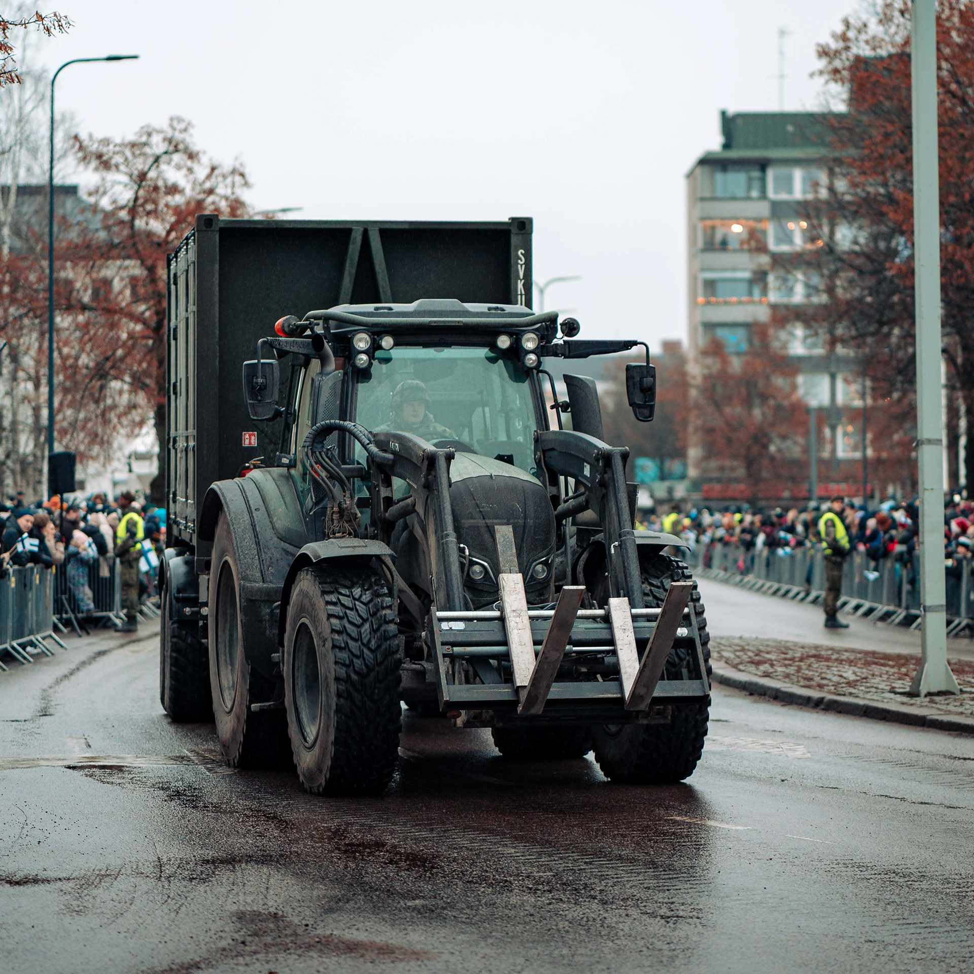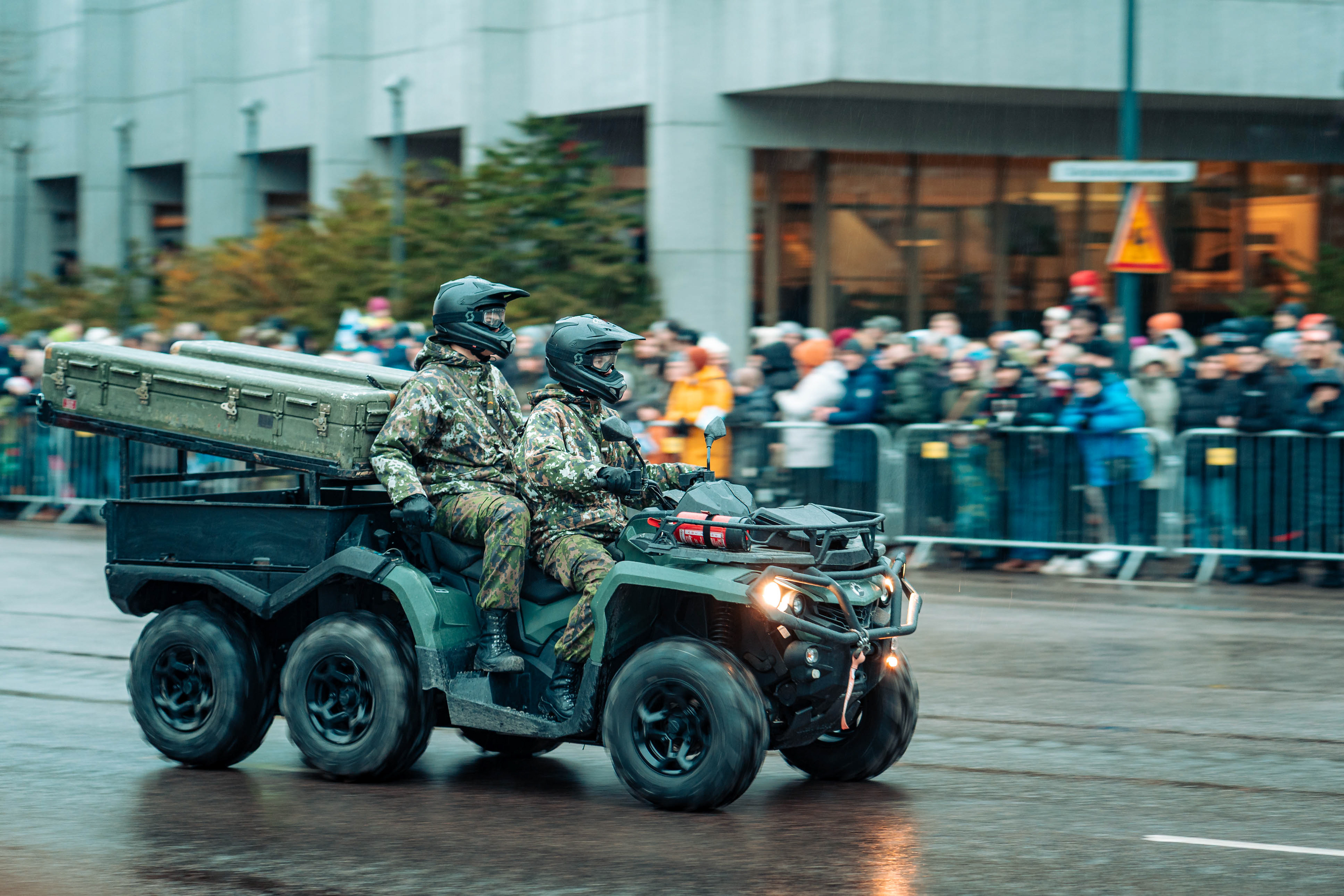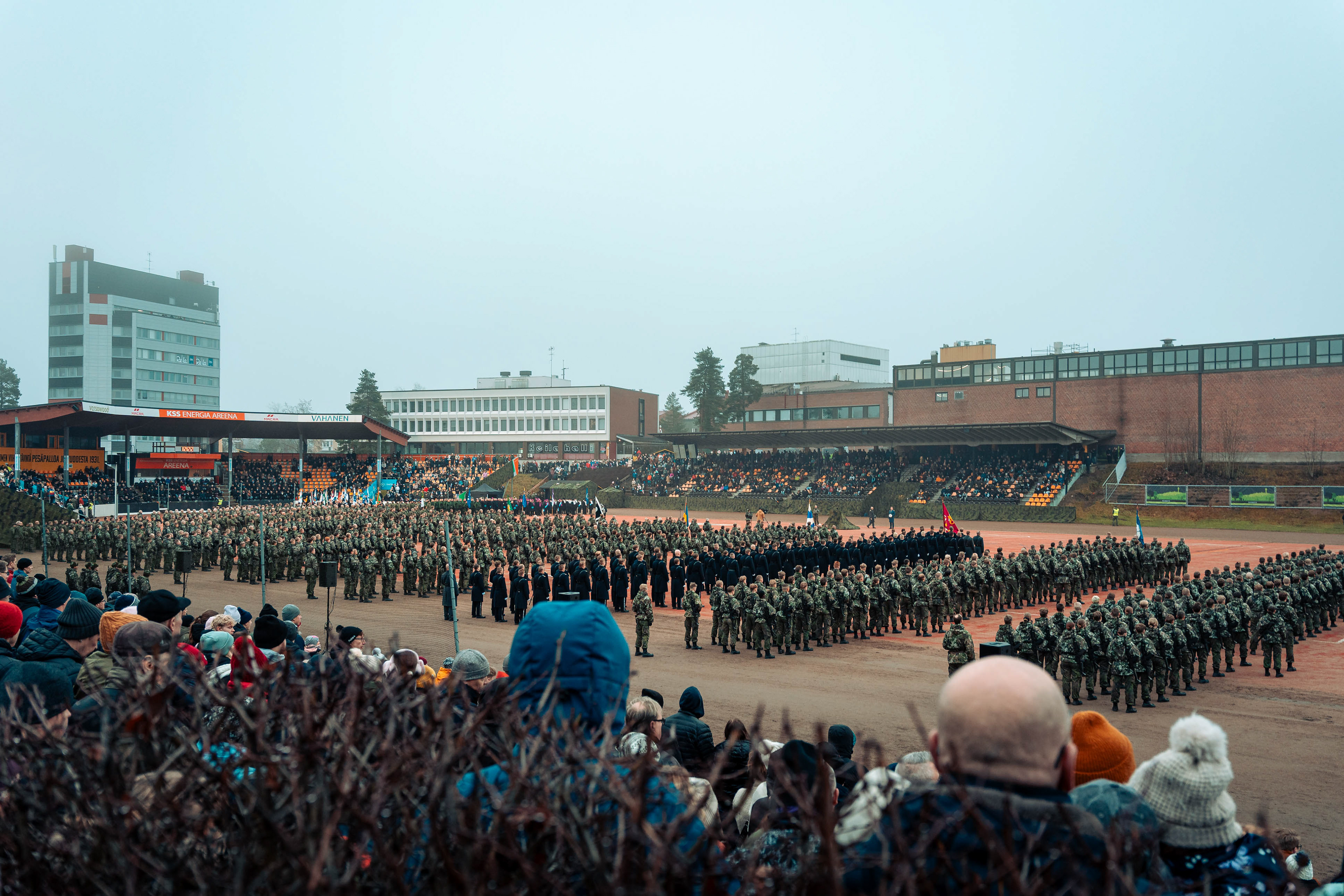 Kielekkeellinen valtionlippu ohimarssin etupäässä.