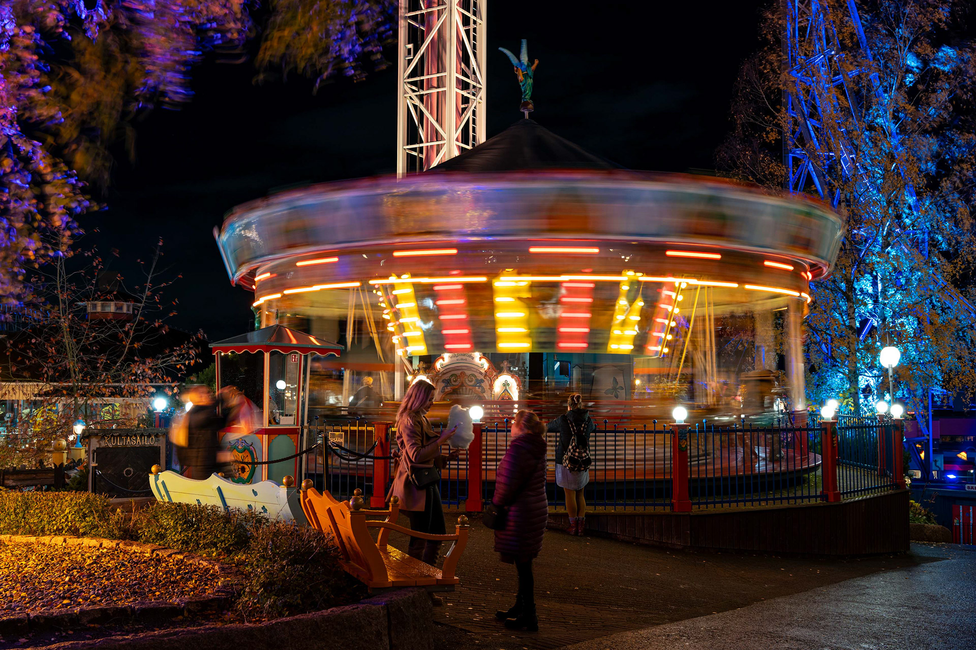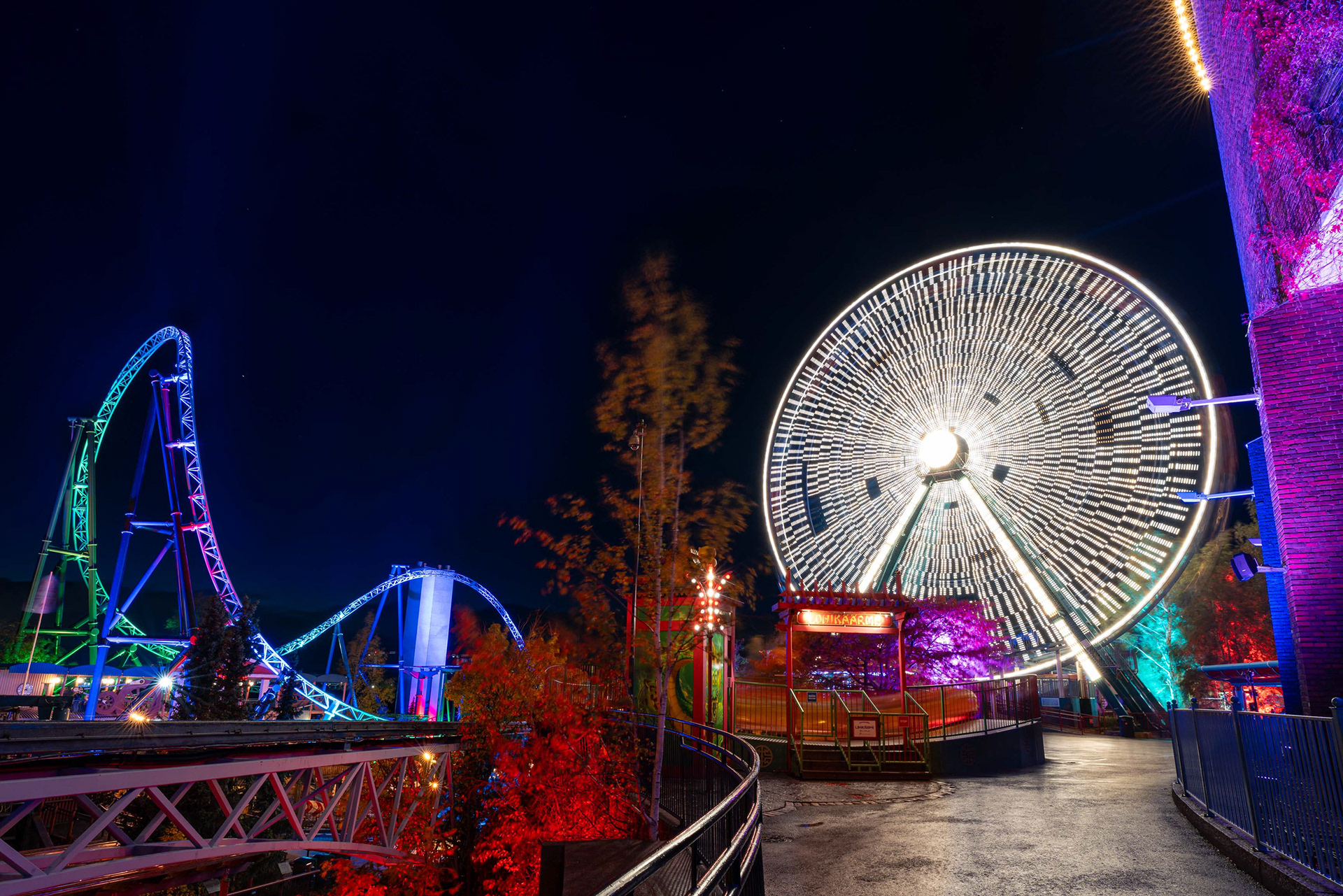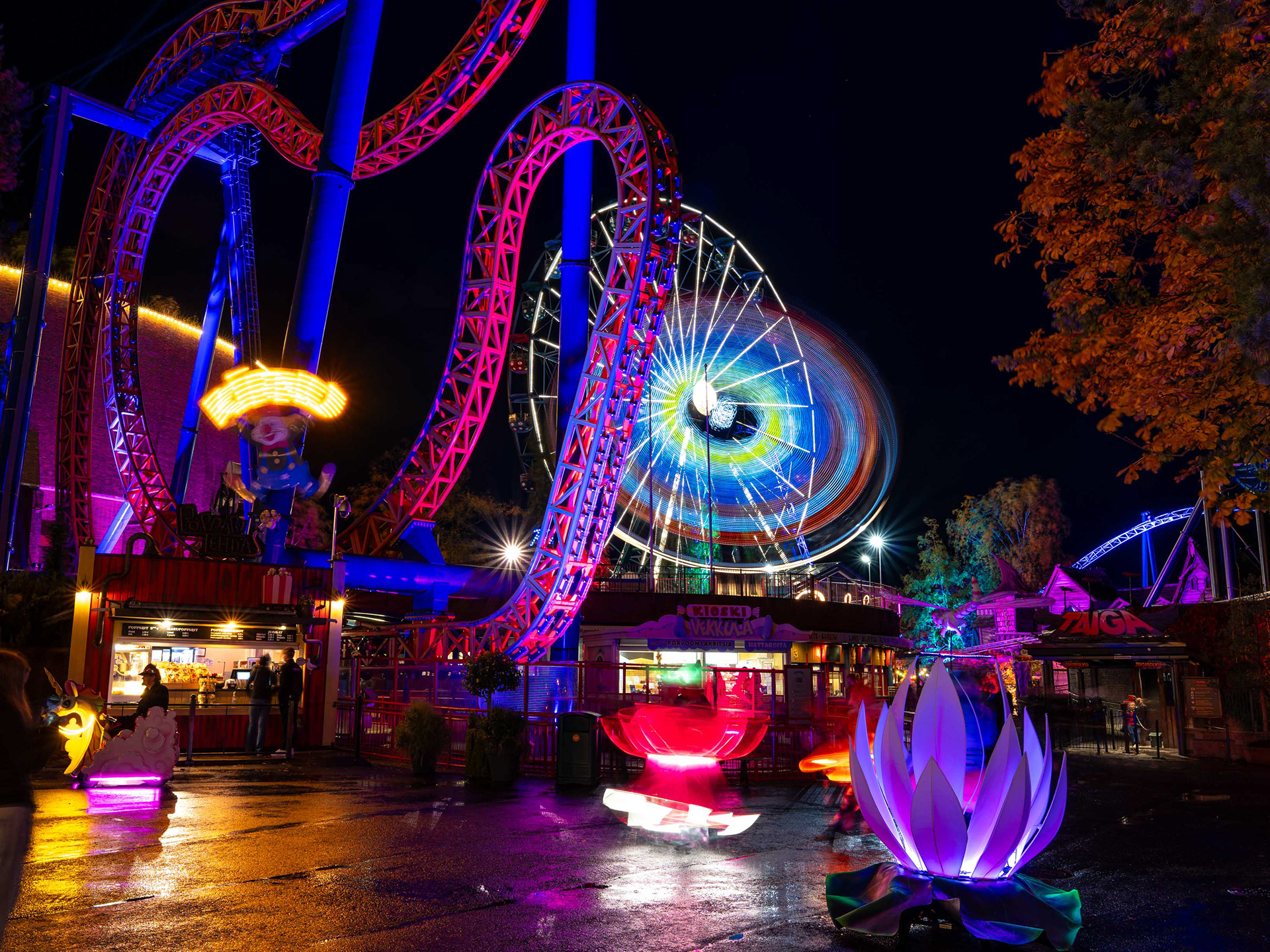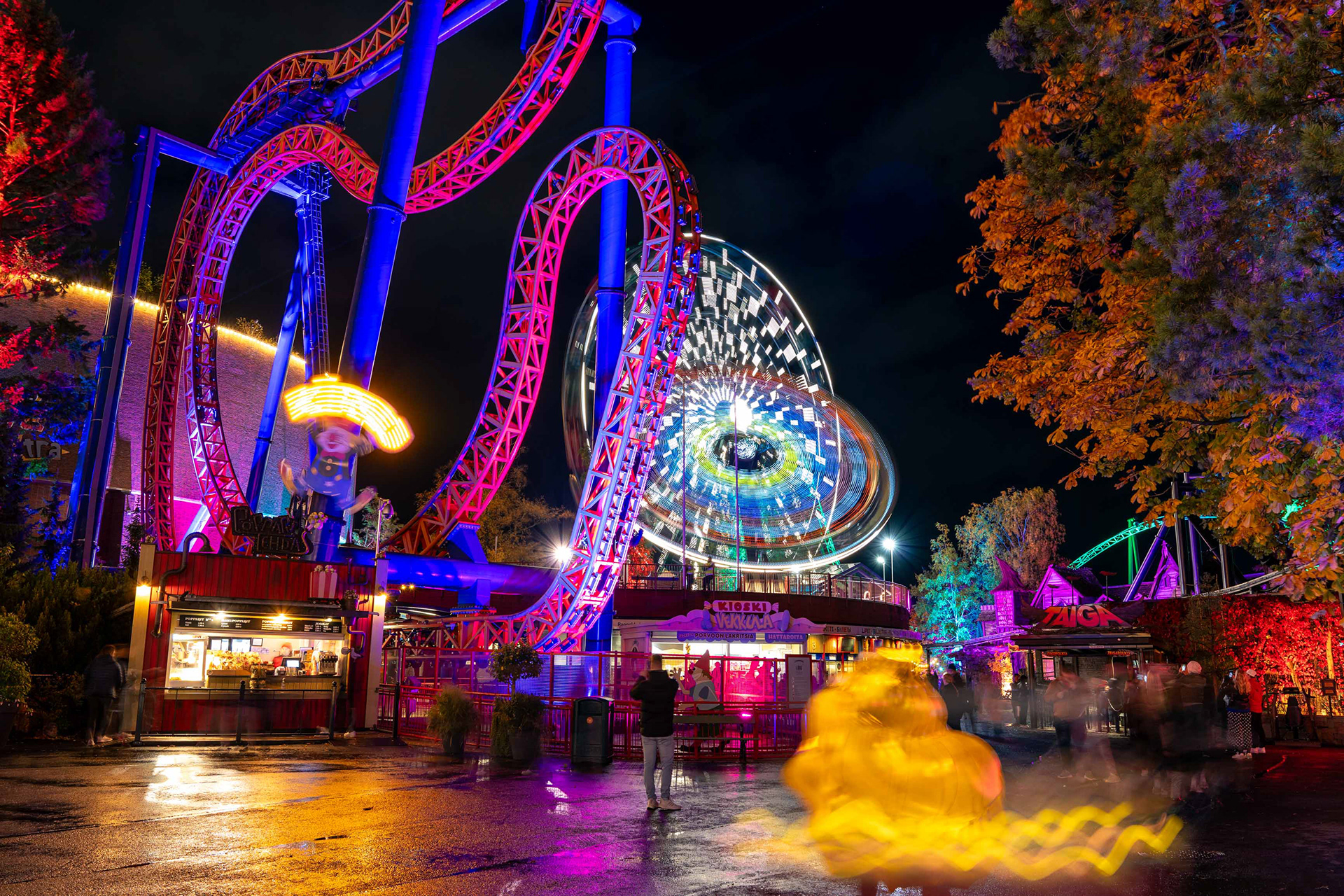 Linnanmäen kauden lopettavat valokarnevaalit toivat värivalojen loistetta pimenevään syysiltaan.