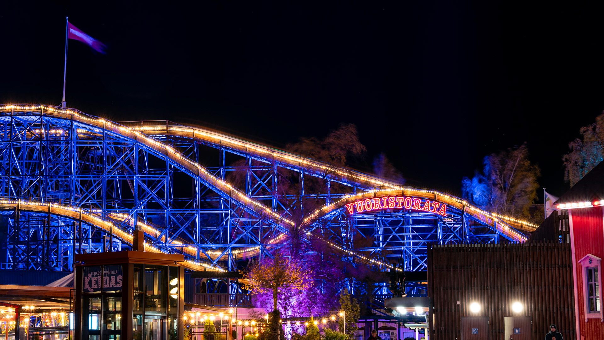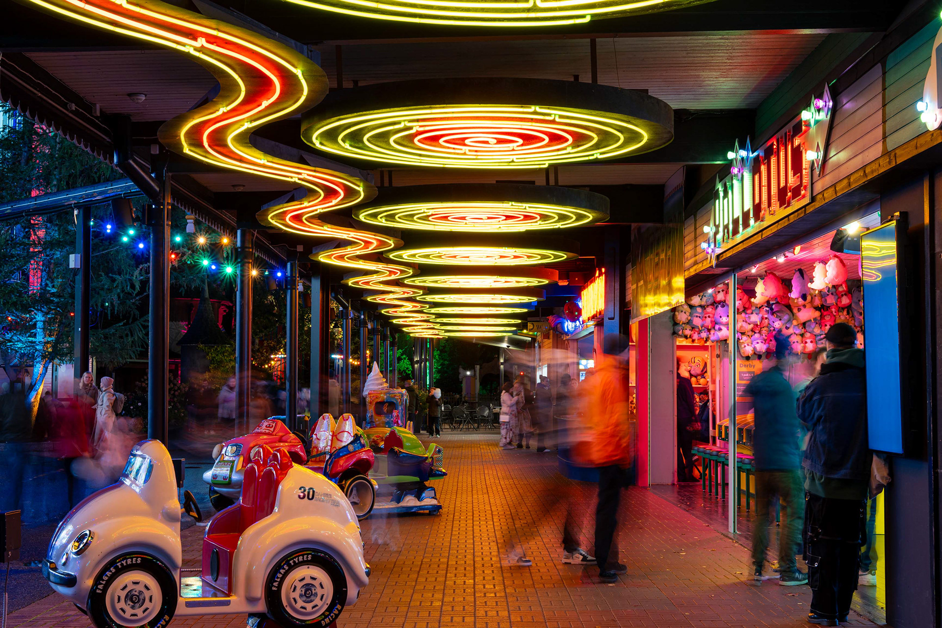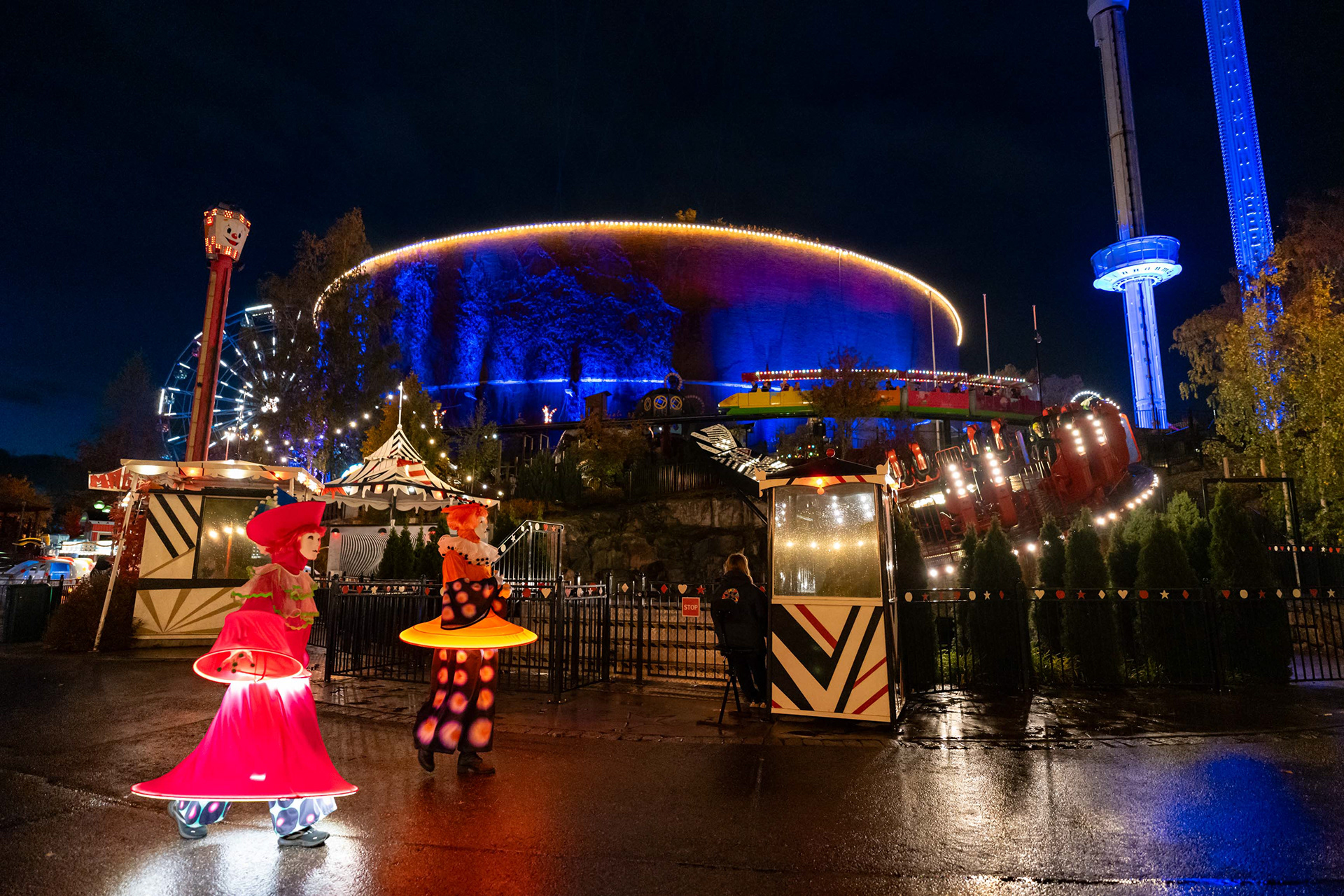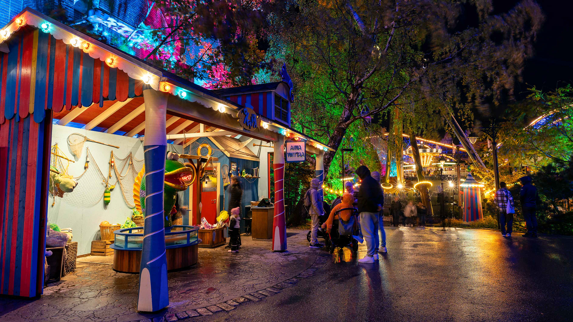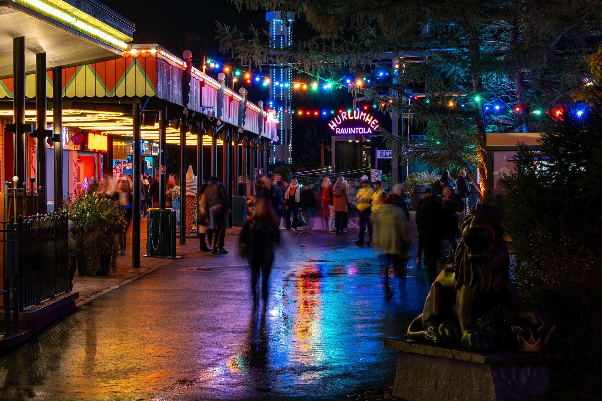 Linnanmäen kauden lopettavat valokarnevaalit toivat värivalojen loistetta pimenevään syysiltaan.